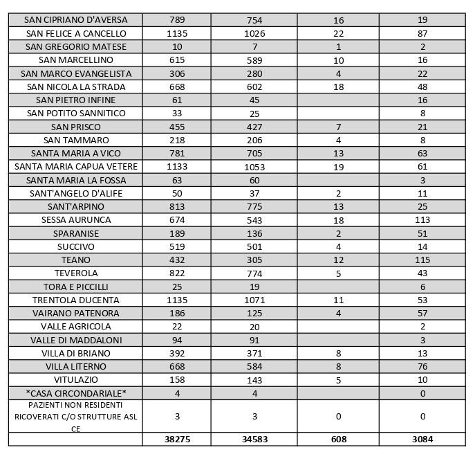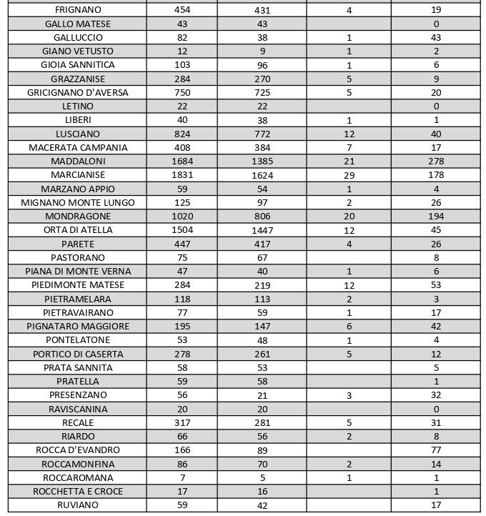 Al di fuori dell’Agro aversano, vanno segnalati i numeri relativi ad altri grossi centri della provincia, nei quali la situazione dei contagi attivi al momento è la seguente: ve ne sono 85 a Capua, 33 a Castel Volturno, 87 a San Felice a Cancello, 63 a Santa Maria a Vico, 61 a Santa Maria Capua Vetere e 76 a Villa Literno.