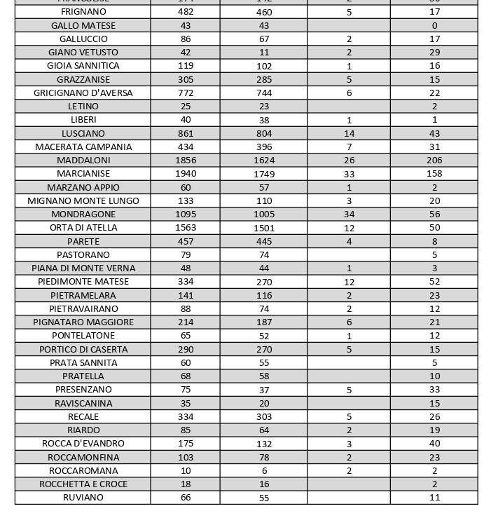 Al di fuori dell’Agro aversano, vanno segnalati i numeri, anche in questo caso più o meno stabili, relativi ad altri grossi centri della provincia, nei quali la situazione dei contagi attivi al momento è la seguente: ve ne sono 69 a Capua, 51 a Casagiove, 59 a Castel Volturno, 56 a Mondragone, 40 a Rocca d’Evandro, 46 a San Nicola la Strada, 66 a Santa Maria a Vico, 58 a Santa Maria Capua Vetere, 143 a Sessa Aurunca, 131 a Teano e 42 a Villa Literno.