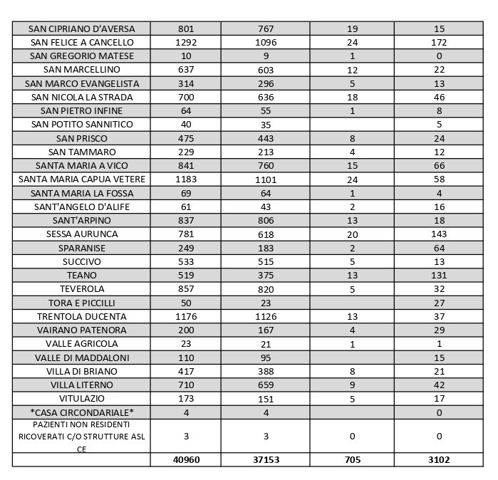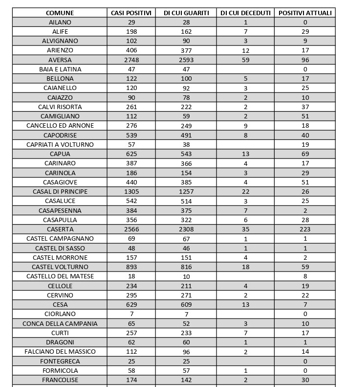I nuovi decessi registrati sul territorio regionale sono 24. In provincia di Caserta, il centro con più positivi attivi è il capoluogo, che ne conta 223. Seguono Maddaloni (206), San Felice a Cancello (172) e Marcianise (158)