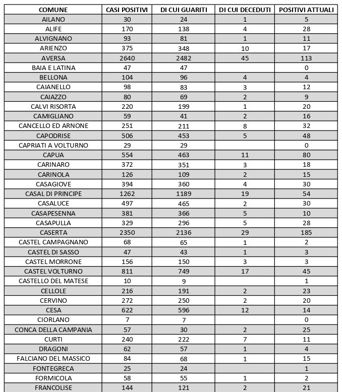 A livello regionale, sono stati registrati ancora 41 nuovi decessi. In Terra di lavoro, il maggior numero di contagi attualmente c'è a Maddaloni (236), Marcianise (186), nel capoluogo (185), Mondragone (206) e Aversa (113)