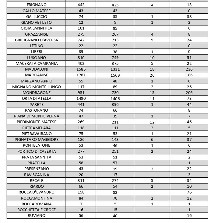 Al di fuori dell’Agro aversano, vanno segnalati i numeri relativi ad altri grossi centri della provincia, nei quali la situazione dei contagi attivi è la seguente: al momento ve ne sono 80 a Capua, 45 a Castel Volturno, 101 a San Felice a Cancello, 75 a Santa Maria a Vico, 87 a Sessa Aurunca e 111 a Teano.