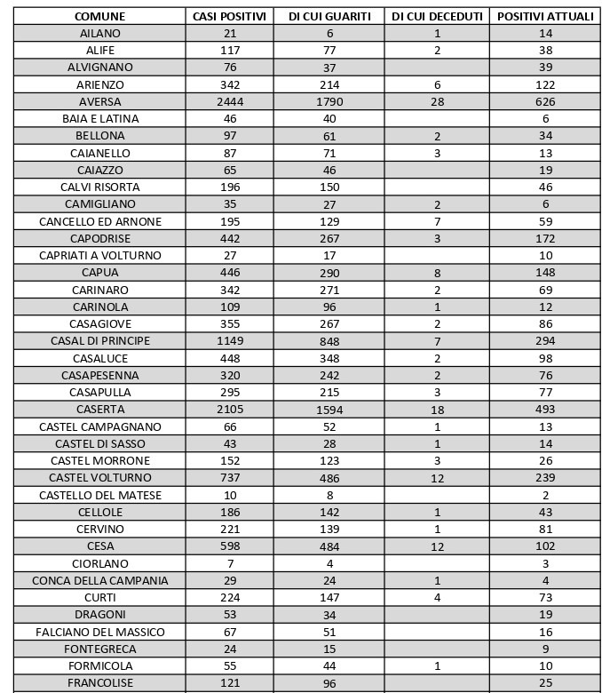 Al di fuori dell’Agro aversano, oltre al numero del capoluogo vanno segnalati quelli relativi almeno agli altri centri più grossi della provincia, nei quali la situazione dei contagi è la seguente: al momento ve ne sono 148 a Capua, 239 a Castel Volturno, 395 a Maddaloni, 191 a Mondragone, 278 a San Felice a Cancello, 209 a Santa Maria a Vico, 271 a Santa Maria Capua Vetere, 193 a Sessa Aurunca e 126 a Villa Literno.