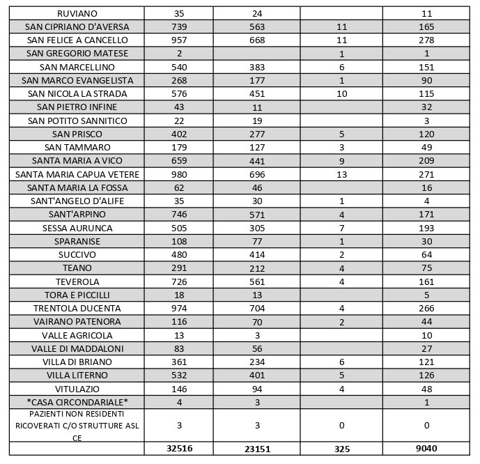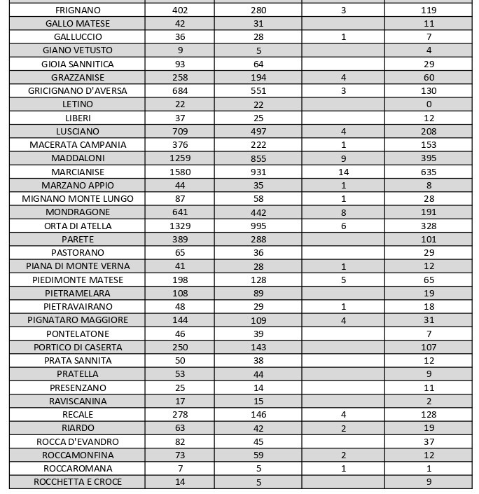 Nel bollettino odierno si registra un decremento sostanziale dei contagi attivi a Caserta, che ne conta attualmente 493 rispetto ai 680 di ieri. La città col maggiore numero di casi di positività in provincia è quindi ora Marcianise, con 635 contagi. Gli occhi restano inoltre ancora puntati, in particolare, su Aversa, che conta 626 casi e sui centri dell’Agro: a Carinaro si contano 69 positivi, Casal di Principe 294, Casaluce 98, Casapesenna 76, Cesa 102, Frignano 119, Gricignano d’Aversa 130, Lusciano 208, Orta di Atella 328, Parete 101, San Cipriano d’Aversa 165, San Marcellino 151, Sant’Arpino 171, Succivo 64, Teverola 161, Trentola Ducenta 266 e Villa di Briano 121.