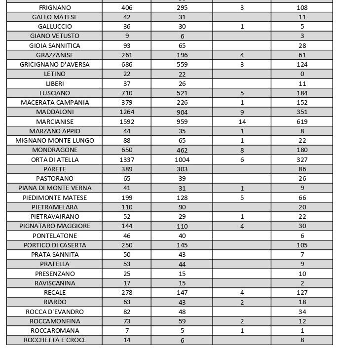 Nel bollettino odierno prosegue il decremento sostanziale dei contagi attivi nella città di Caserta, che ne conta attualmente 472 rispetto ai 493 del giorno precedente. La città col maggiore numero di casi di positività in provincia è quindi ora Marcianise, con 619 contagi. Gli occhi restano inoltre ancora puntati, in particolare, su Aversa, che conta 604 casi e sui centri dell’Agro: a Carinaro si contano 69 positivi, Casal di Principe 278, Casaluce 97, Casapesenna 75, Cesa 99, Frignano 108, Gricignano d’Aversa 124, Lusciano 184, Orta di Atella 327, Parete 86, San Cipriano d’Aversa 158, San Marcellino 142, Sant’Arpino 174, Succivo 65, Teverola 145, Trentola Ducenta 229 e Villa di Briano 101.