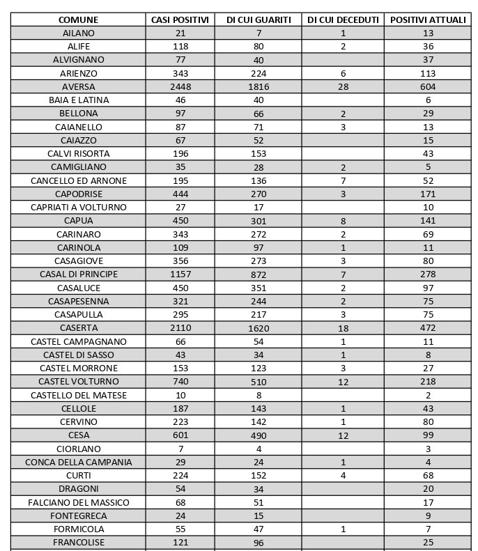 Al di fuori dell’Agro aversano, oltre al numero del capoluogo vanno segnalati quelli relativi almeno agli altri centri più grossi della provincia, nei quali la situazione dei contagi è la seguente: al momento ve ne sono 141 a Capua, 218 a Castel Volturno, 351 a Maddaloni, 180 a Mondragone, 266 a San Felice a Cancello, 197 a Santa Maria a Vico, 263 a Santa Maria Capua Vetere, 191 a Sessa Aurunca e 124 a Villa Literno.