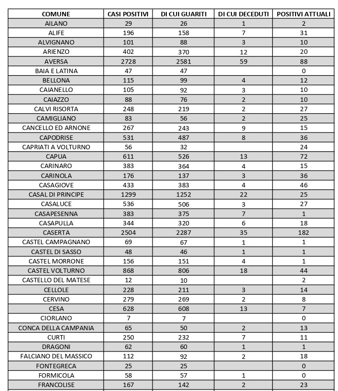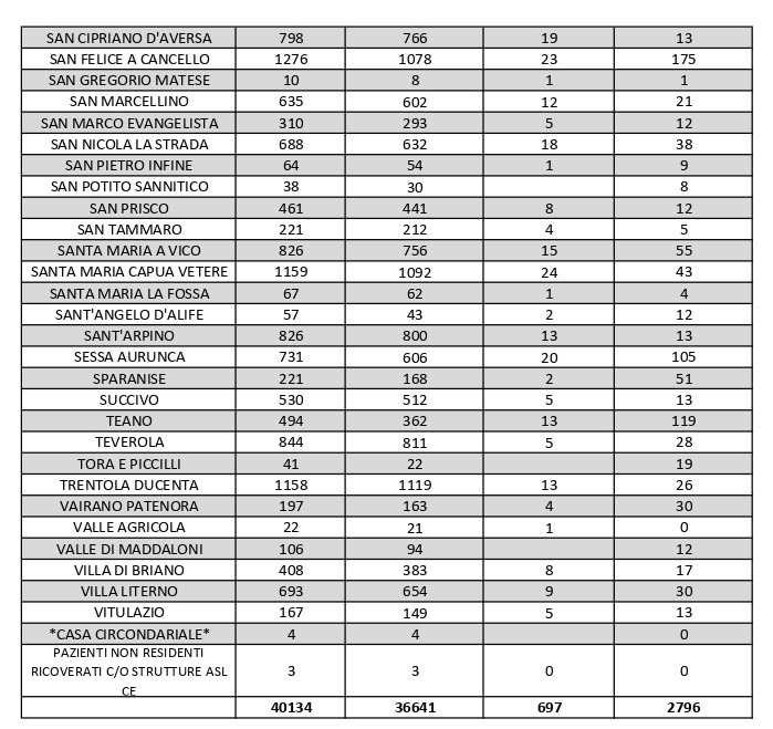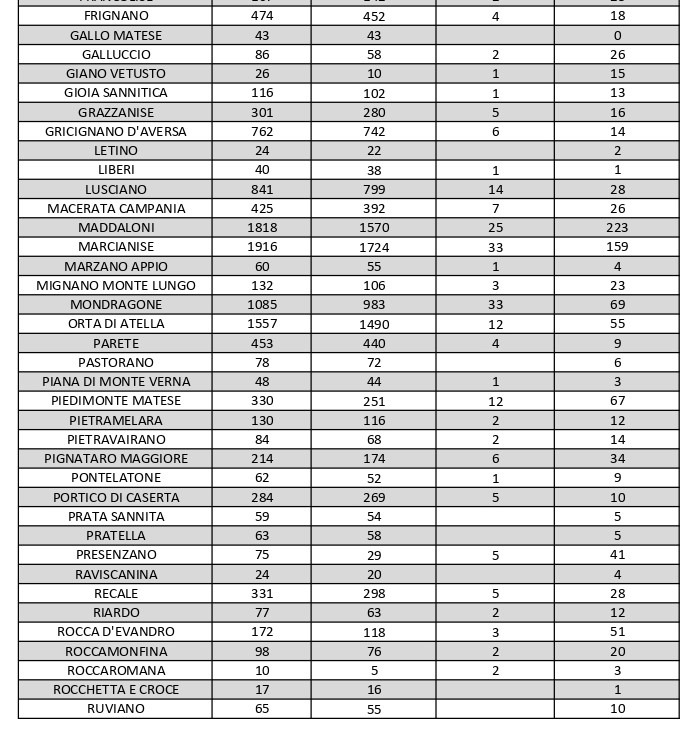 Al di fuori dell’Agro aversano, vanno segnalati i numeri, anche in questo caso più o meno stabili, relativi ad altri grossi centri della provincia, nei quali la situazione dei contagi attivi al momento è la seguente: ve ne sono 72 a Capua, 46 a Casagiove, 44 a Castel Volturno, 69 a Mondragone, 51 a Rocca d’Evandro, 38 a San Nicola la Strada, 55 a Santa Maria a Vico, 43 a Santa Maria Capua Vetere, 105 a Sessa Aurunca, 119 a Teano e 30 a Villa Literno.