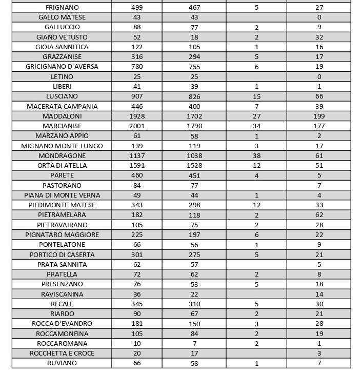 Al di fuori dell’Agro aversano, vanno segnalati i numeri, anche in questo caso più o meno stabili, relativi ad altri grossi centri della provincia, nei quali la situazione dei contagi attivi al momento è la seguente: ve ne sono 62 a Capua,41 a Casagiove, 94 a Castel Volturno, 61 a Mondragone,62 a Pietramelara, 59 a San Nicola la Strada, 79 a Santa Maria a Vico, 120 a Santa Maria Capua Vetere, 135 a Sessa Aurunca, 114 a Teano e 32 a Villa Literno.