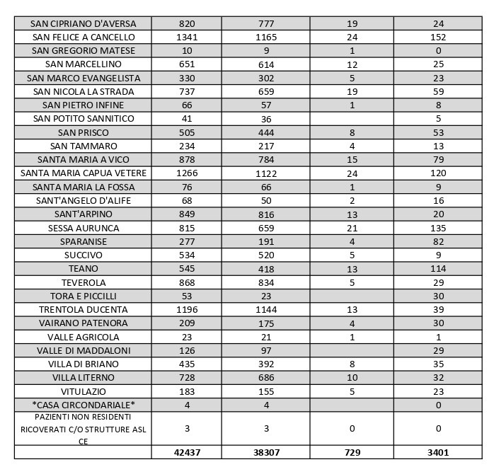 In provincia di Caserta, dove i nuovi decessi registrati sono due, il centro con più positivi attivi è il capoluogo, che ne conta 226. Seguono Maddaloni (199), Marcianise (177) e San Felice a Cancello (152)