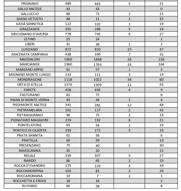 Al di fuori dell’Agro aversano, vanno segnalati i numeri, anche in questo caso più o meno stabili, relativi ad altri grossi centri della provincia, nei quali la situazione dei contagi attivi al momento è la seguente: ve ne sono 68 a Capua, 48 a Casagiove, 84 a Castel Volturno, 60 a Mondragone, 39 a Rocca d’Evandro, 43 a San Nicola la Strada, 66 a Santa Maria a Vico, 78 a Santa Maria Capua Vetere, 139 a Sessa Aurunca, 128 a Teano e 48 a Villa Literno.