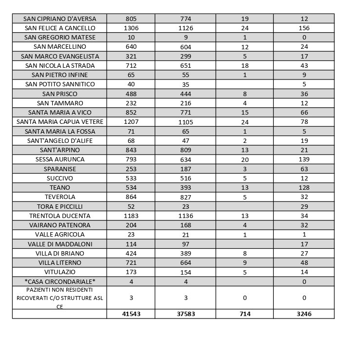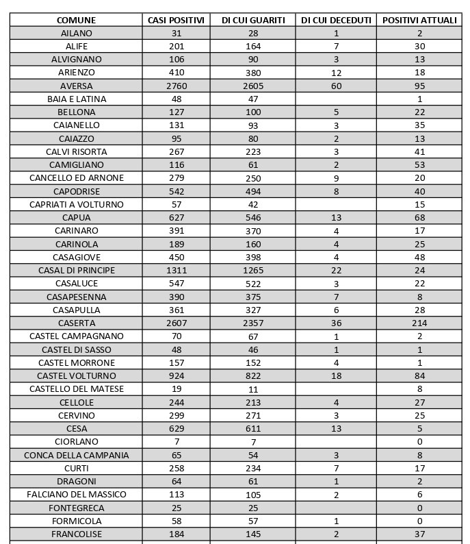 I nuovi decessi registrati sul territorio regionale sono 15. In provincia di Caserta, il centro con più positivi attivi è Maddaloni, che ne conta 226. Seguono il capoluogo (214), Marcianise (164) e San Felice a Cancello (156)