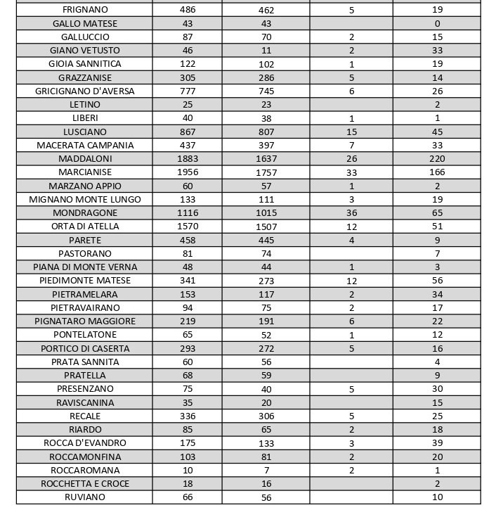 Al di fuori dell’Agro aversano, vanno segnalati i numeri, anche in questo caso più o meno stabili, relativi ad altri grossi centri della provincia, nei quali la situazione dei contagi attivi al momento è la seguente: ve ne sono 69 a Capua, 54 a Casagiove, 77 a Castel Volturno, 65 a Mondragone, 39 a Rocca d’Evandro, 52 a San Nicola la Strada, 66 a Santa Maria a Vico, 65 a Santa Maria Capua Vetere, 140 a Sessa Aurunca, 130 a Teano e 44 a Villa Literno.
