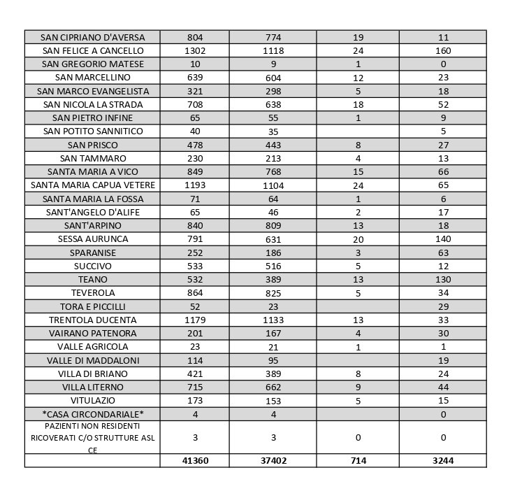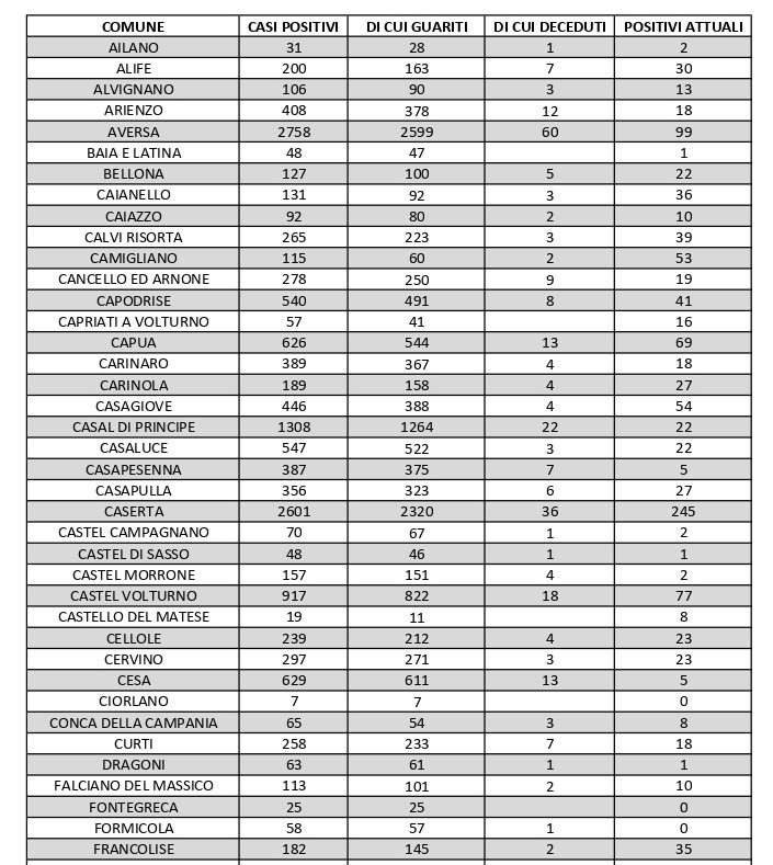 I nuovi decessi registrati sul territorio regionale sono 12. In provincia di Caserta, il centro con più positivi attivi è il capoluogo, che ne conta 245. Seguono Maddaloni (220), Marcianise (166) e San Felice a Cancello (160)