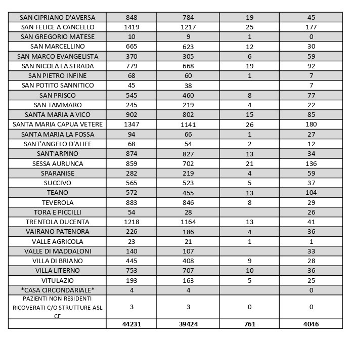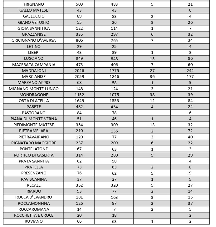 Al di fuori dell’Agro aversano, vanno segnalati i numeri relativi ad altri grossi centri della provincia, nei quali la situazione dei contagi attivi al momento è la seguente: ve ne sono 69 a Capua, 63 a Casagiove, 66 a Castel Volturno, 39 a Mondragone, 72 a Pietramelara, 92 a San Nicola la Strada, 85 a Santa Maria a Vico, 136 a Sessa Aurunca, 104 a Teano e 36 a Villa Literno.