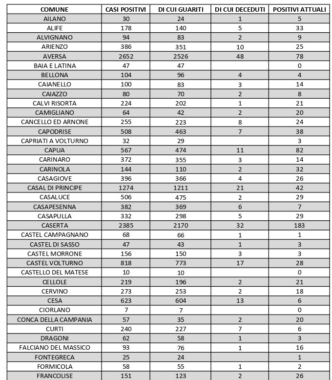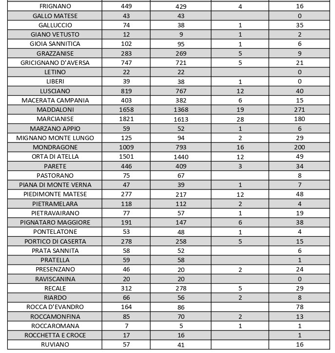 Al di fuori dell’Agro aversano, vanno segnalati i numeri relativi ad altri grossi centri della provincia, nei quali la situazione dei contagi attivi al momento è la seguente: ve ne sono 82 a Capua, 28 a Castel Volturno, 87 a San Felice a Cancello, 68 a Santa Maria a Vico e 60 a Santa Maria Capua Vetere.