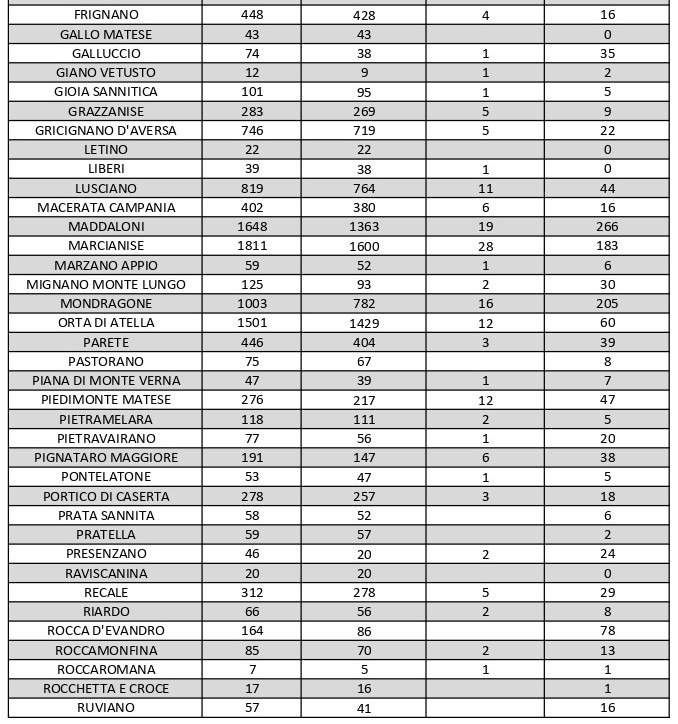 Al di fuori dell’Agro aversano, vanno segnalati i numeri relativi ad altri grossi centri della provincia, nei quali la situazione dei contagi attivi al momento è la seguente: ve ne sono 84 a Capua, 30 a Castel Volturno, 90 a San Felice a Cancello, 72 a Santa Maria a Vico e 62 a Santa Maria Capua Vetere.