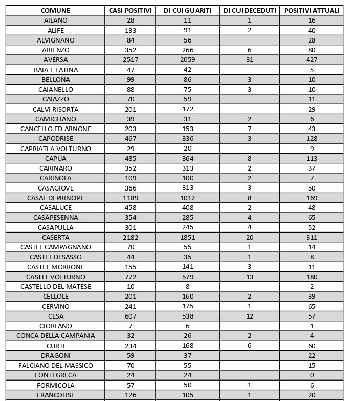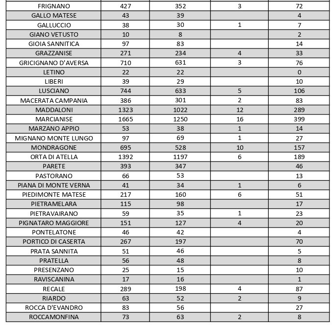 Al di fuori dell’Agro aversano, oltre al numero del capoluogo vanno segnalati quelli relativi almeno agli altri centri più grossi della provincia, nei quali la situazione dei contagi attivi è la seguente: al momento ve ne sono 113 a Capua, 180 a Castel Volturno, 289 a Maddaloni, 157 a Mondragone, 188 a San Felice a Cancello, 144 a Santa Maria a Vico, 219 a Santa Maria Capua Vetere, 179 a Sessa Aurunca e 65 a Villa Literno.