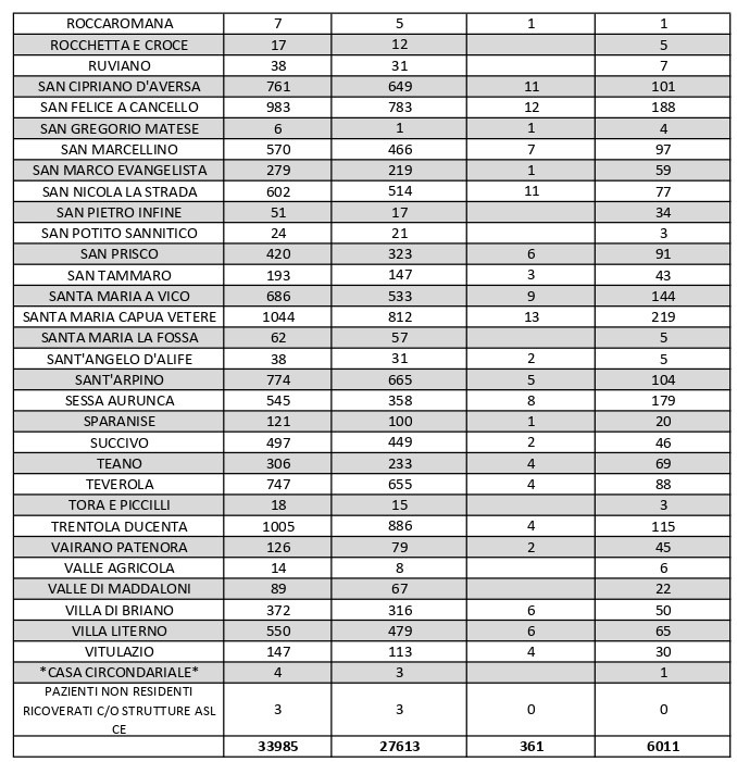 Nel bollettino odierno prosegue il decremento dei contagi attivi nella città di Caserta, che ne conta attualmente 311. La città col maggiore numero di casi di positività in provincia resta, anche oggi, Aversa, che pur con numeri in calo conta comunque 427 casi. Alle sue spalle c’è Marcianise, con 399 contagi. Occhi puntati ancora sull’Agro aversano, dove i centri abitati sono tutti adiacenti tra loro e il virus ha ancora una certa diffusione: Carinaro conta 37 positivi, Casal di Principe 169, Casaluce 48, Casapesenna 65, Cesa 57, Frignano 72, Gricignano d’Aversa 76, Lusciano 106, Orta di Atella 189, Parete 46, San Cipriano d’Aversa 101, San Marcellino 97, Sant’Arpino 104, Succivo 46, Teverola 88, Trentola Ducenta 115 e Villa di Briano 50.
