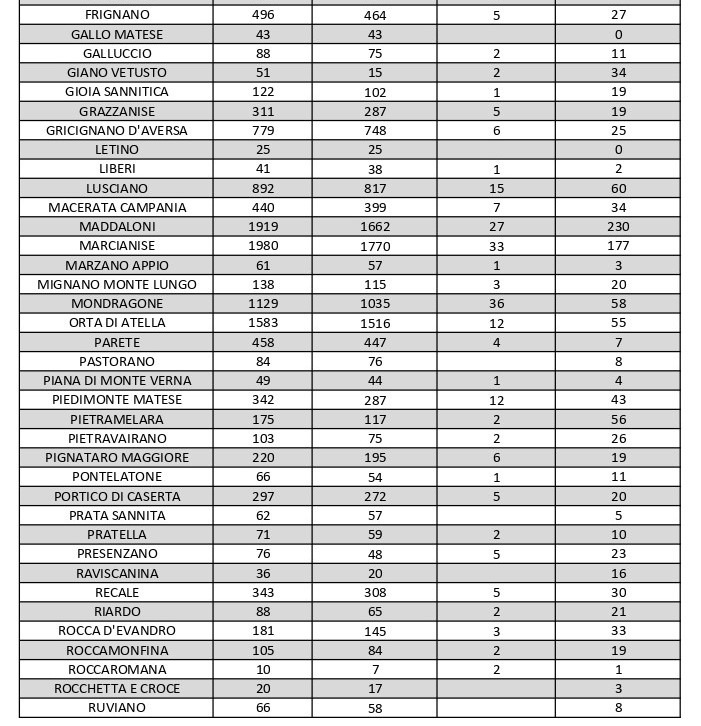 Al di fuori dell’Agro aversano, vanno segnalati i numeri, anche in questo caso più o meno stabili, relativi ad altri grossi centri della provincia, nei quali la situazione dei contagi attivi al momento è la seguente: ve ne sono 74 a Capua, 49 a Casagiove, 82 a Castel Volturno, 58 a Mondragone, 33 a Rocca d’Evandro, 48 a San Nicola la Strada, 74 a Santa Maria a Vico, 97 a Santa Maria Capua Vetere, 135 a Sessa Aurunca, 125 a Teano e 39 a Villa Literno.
