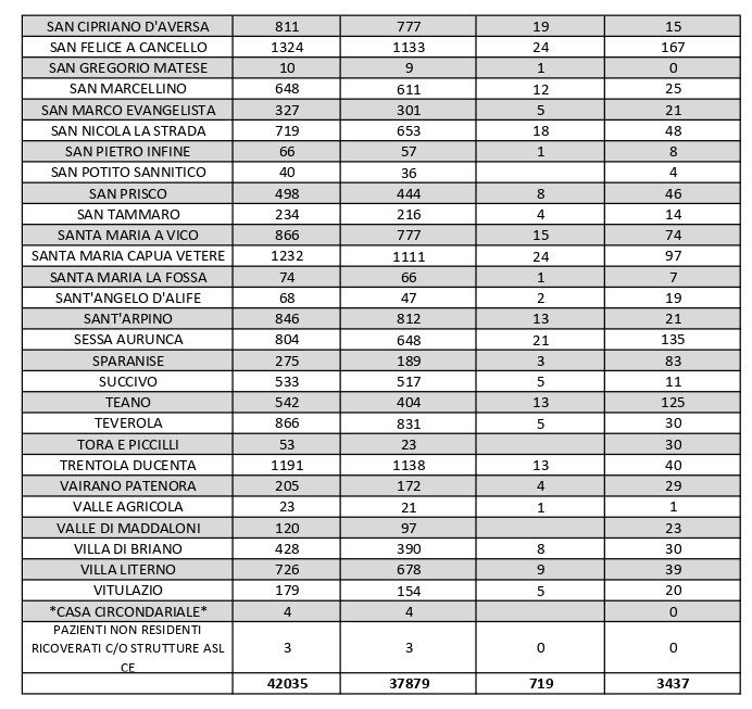 I nuovi decessi registrati sul territorio regionale sono 16, tre dei quali in provincia di Caserta, dove il centro con più positivi attivi è il capoluogo, che ne conta 231. Seguono Maddaloni (230), Marcianise (177) e San Felice a Cancello (167)