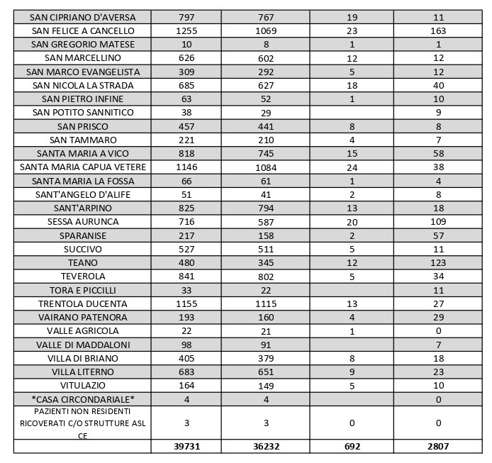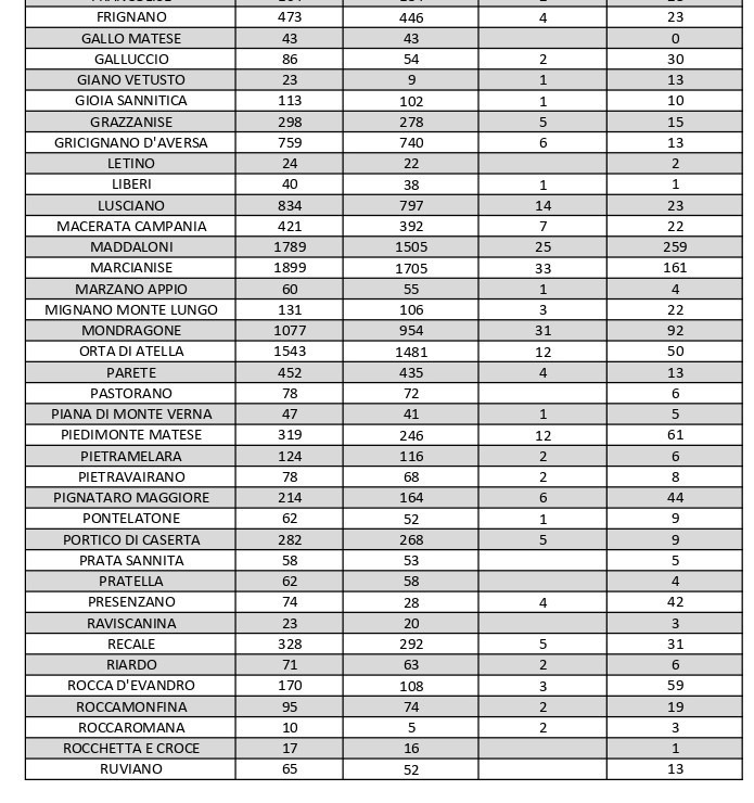 Anche nell’Agro aversano, area densamente popolata con i centri abitati tutti adiacenti tra loro, la situazione è in chiaro peggioramento con i seguenti dati riferiti alle singole realtà territoriali: Aversa conta 74 positivi, Carinaro 16, Casal di Principe 28, Casaluce 32, Casapesenna 2, Cesa 5, Frignano 23, Gricignano d’Aversa 13, Lusciano 23, Orta di Atella 50, Parete 13, San Cipriano d’Aversa 11, San Marcellino 12, Sant’Arpino18, Succivo 11, Teverola 34, Trentola Ducenta 27 e Villa di Briano 18. Al di fuori dell’Agro aversano, vanno segnalati i numeri, anche in questo caso non incoraggianti, relativi ad altri grossi centri della provincia, nei quali la situazione dei contagi attivi al momento è la seguente: ve ne sono 84 a Capua, 46 a Casagiove, 43 a Castel Volturno, 92 a Mondragone, 59 a Rocca d’Evandro, 40 a San Nicola la Strada, 58 a Santa Maria a Vico, 38 a Santa Maria Capua Vetere, 109 a Sessa Aurunca, 123 a Teano e 23 a Villa Literno.