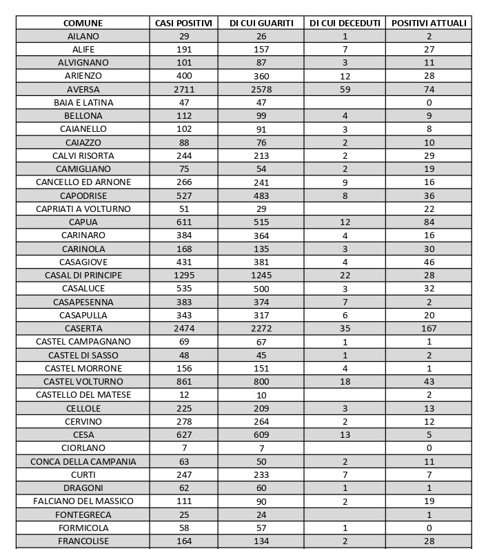 Sul territorio regionale sono stati registrati otto morti. Due, invece, in provincia di Caserta, dove il centro con più positivi attivi resta Maddaloni (con 259), seguito dal capoluogo (con 167) e da San Felice a Cancello (con 163)