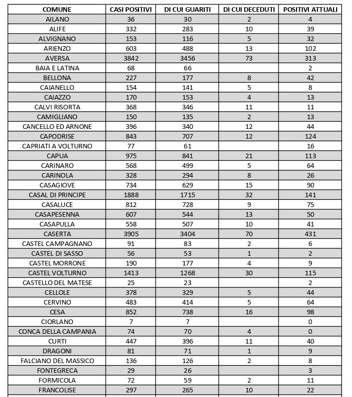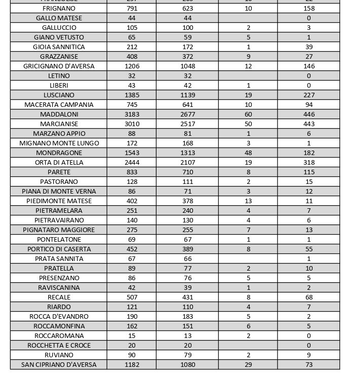 Vanno inoltre segnalati i numeri dei contagi attivi relativi ad altri centri del Casertano: ve ne sono 113 a Capua, 90 a Casagiove, 41 a Casapulla, 115 a Castel Volturno, 94 a Macerata Campania, 182 a Mondragone, 151 a San Nicola la Strada, 84 a San Prisco, 142 a Santa Maria a Vico, 206 a Santa Maria Capua Vetere, 109 a Sessa Aurunca, 27 a Teano e 84 a Villa Literno.