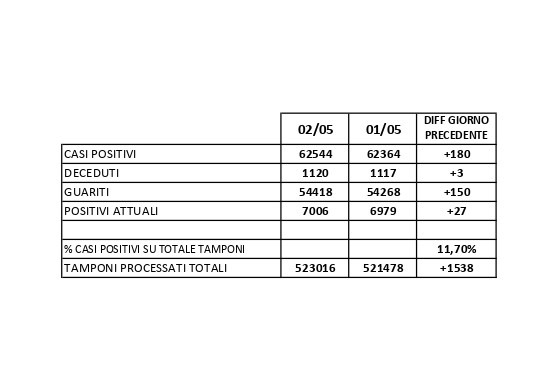 Covid-19: oggi nel Casertano 180 casi su 1.538 test, 150 guariti e tre morti