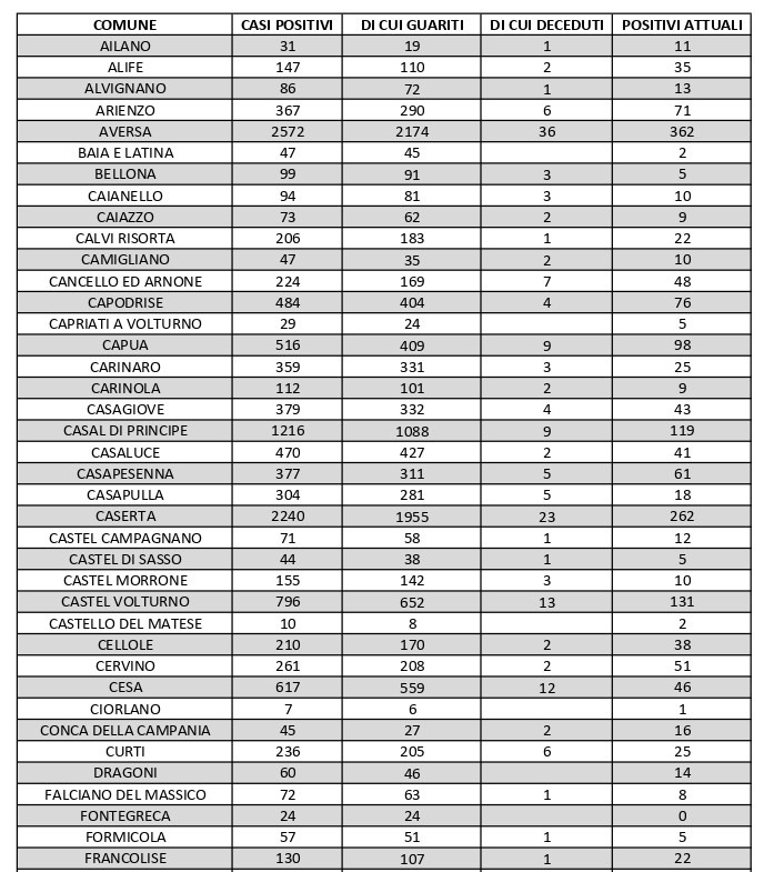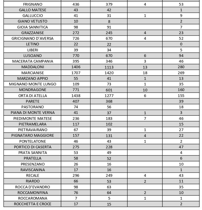Nel bollettino odierno calano ancora i contagi attivi nella città di Caserta, che ne conta attualmente 262. La città col maggiore numero di casi di positività in provincia resta, anche oggi, Aversa, che conta attualmente 362 positivi. Alle sue spalle c’è Maddaloni, con 280 contagi. Occhi puntati ancora sull’Agro aversano, dove i centri abitati sono tutti adiacenti tra loro e il virus ha ancora una certa diffusione, con dati quasi ovunque in leggero aumento: Carinaro conta 25 positivi, Casal di Principe 119, Casaluce 41, Casapesenna 61, Cesa 46, Frignano 53, Gricignano d’Aversa 52, Lusciano 94, Orta di Atella 155, Parete 39, San Cipriano d’Aversa 68, San Marcellino 74, Sant’Arpino 84, Succivo 33, Teverola 73, Trentola Ducenta 110 e Villa di Briano 33.