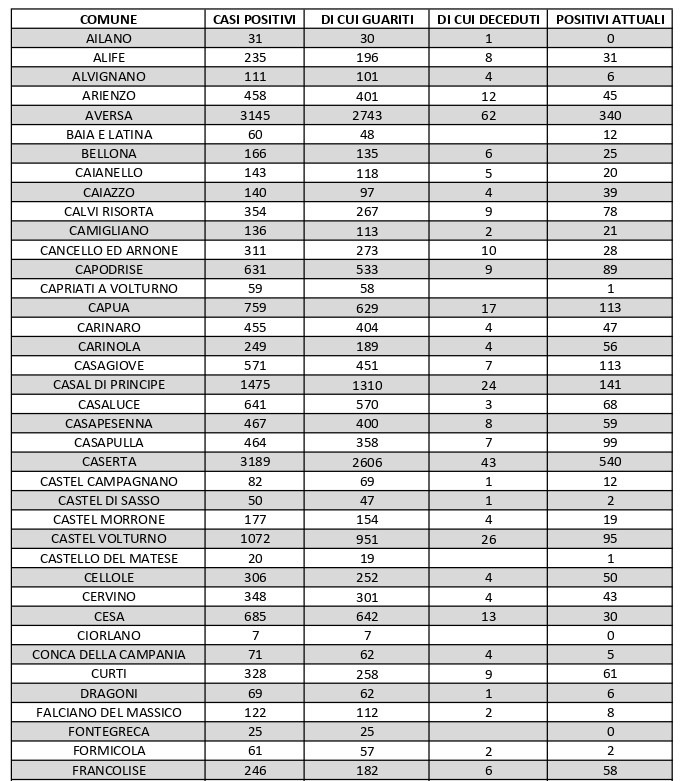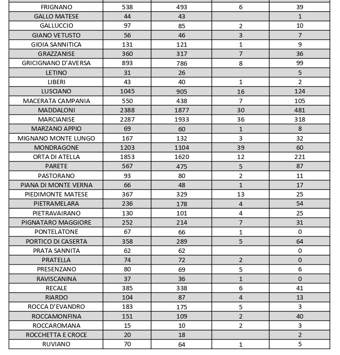I numeri di Aversa vanno letti tenendo conto anche dei casi dei Comuni limitrofi: le persone attualmente positive sono 47 a Carinaro, 68 a Casaluce, 30 a Cesa, 99 a Gricignano d’Aversa, 124 a Lusciano, 87 a Parete,104 a San Marcellino, 71 a Teverola e 100 a Trentola Ducenta. Nei centri siti ai margini dell’Agro aversano la situazione è la seguente: Casal di Principe conta 141 contagi, Casapesenna 59, Frignano 39, San Cipriano d’Aversa 97, Sant’Arpino 89, Succivo 65 e Villa di Briano 63.