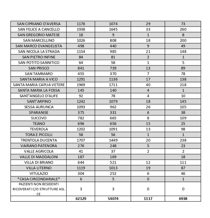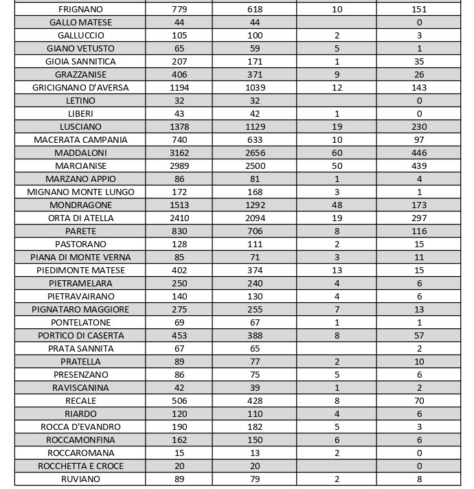 I numeri di Aversa vanno letti tenendo conto anche dei casi dei Comuni dell’intero Agro, area densamente popolata con i centri abitati tutti adiacenti tra loro. Questi i dati riferiti alle singole realtà territoriali: le persone attualmente positive sono 63 a Carinaro, 71 a Casaluce, 95 a Cesa, 143 a Gricignano d’Aversa, 230 a Lusciano, 116 a Parete, 200 a San Marcellino, 98 a Teverola e 238 a Trentola Ducenta. Nei centri siti ai margini dell’Agro aversano la situazione è la seguente: Casal di Principe conta 139 contagi, Casapesenna 52, Frignano 151, San Cipriano d’Aversa 73, Sant’Arpino 145, Succivo 109 e Villa di Briano 111.