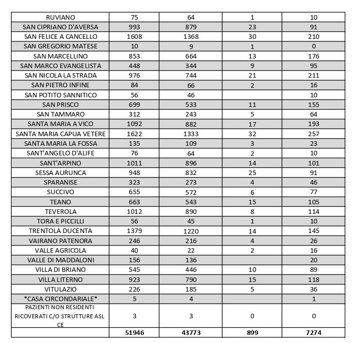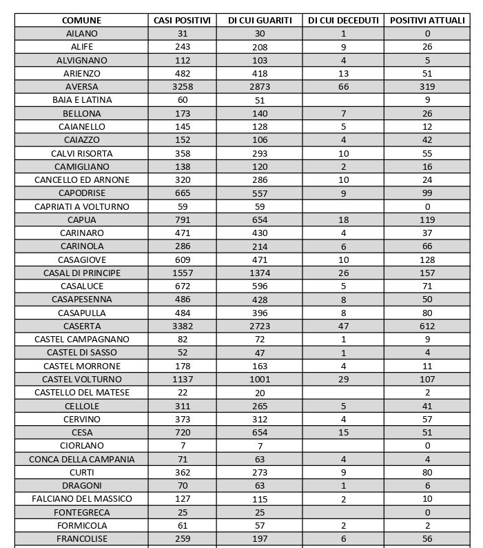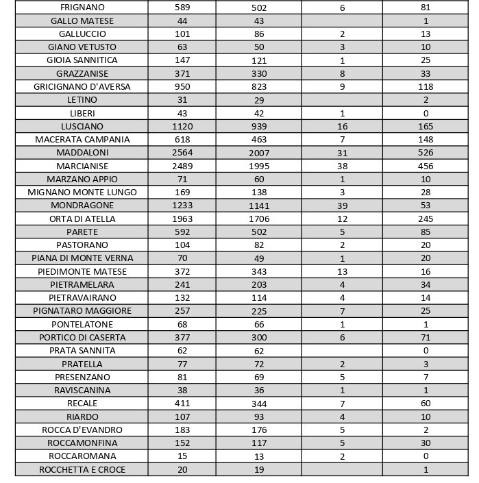 I numeri di Aversa vanno letti tenendo conto anche dei casi dei Comuni dell’intero Agro, area densamente popolata con i centri abitati tutti adiacenti tra loro. Questi i dati riferiti alle singole realtà territoriali: le persone attualmente positive sono 37 a Carinaro, 71 a Casaluce, 51 a Cesa, 118 a Gricignano d’Aversa, 165 a Lusciano, 85 a Parete, 176 a San Marcellino, 114 a Teverola e 145 a Trentola Ducenta. Nei centri siti ai margini dell’Agro aversano la situazione è la seguente: Casal di Principe conta 157 contagi, Casapesenna 50, Frignano 81, San Cipriano d’Aversa 91, Sant’Arpino 101, Succivo 77 e Villa di Briano 89.