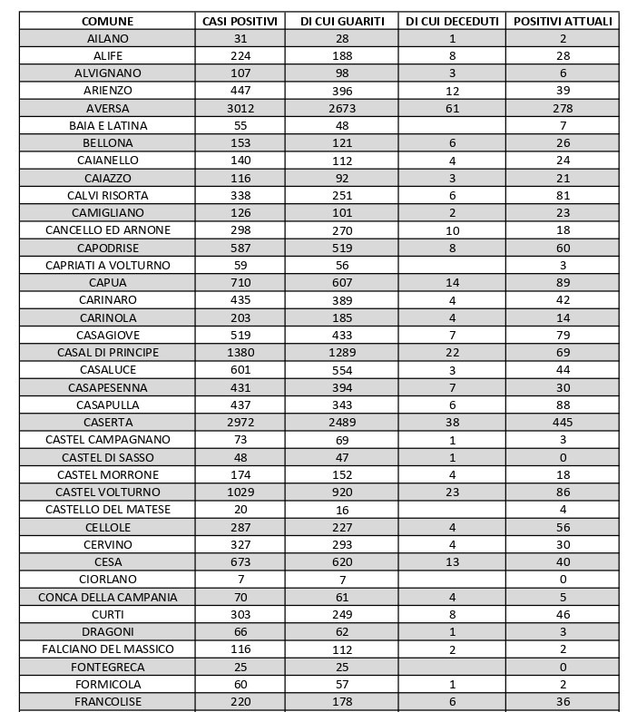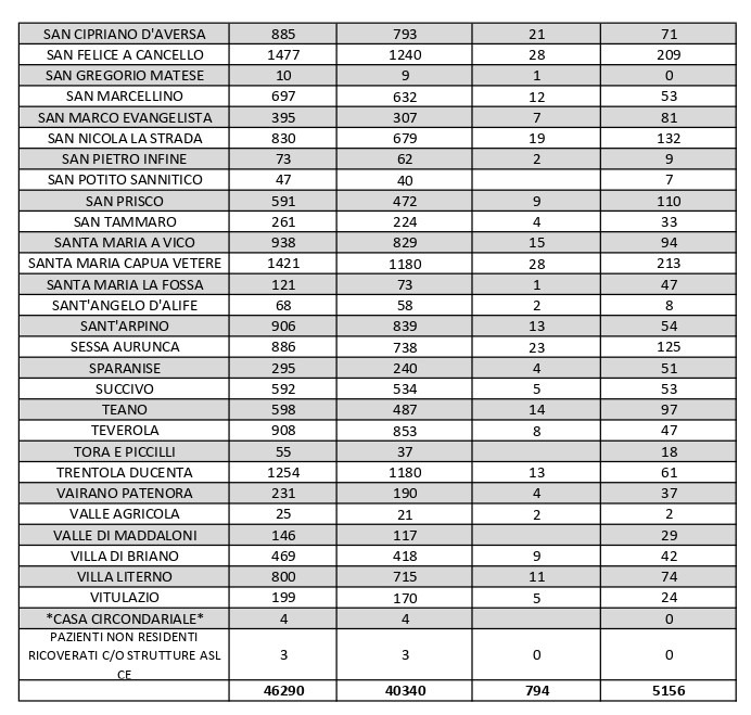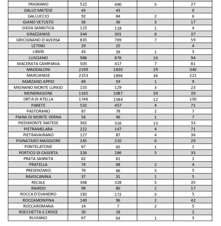 Vanno inoltre segnalati i numeri dei contagi attivi relativi ad altri centri del Casertano: ve ne sono 81 a Calvi Risorta, 89 a Capua, 79 a Casagiove, 88 a Casapulla, 86 a Castel Volturno, 81 a Macerata Campania, 39 a Mondragone, 71 a Pietramelara, 132 a San Nicola la Strada, 110 a San Prisco, 94 a Santa Maria a Vico, 125 a Sessa Aurunca, 97 a Teano e 74 a Villa Literno.