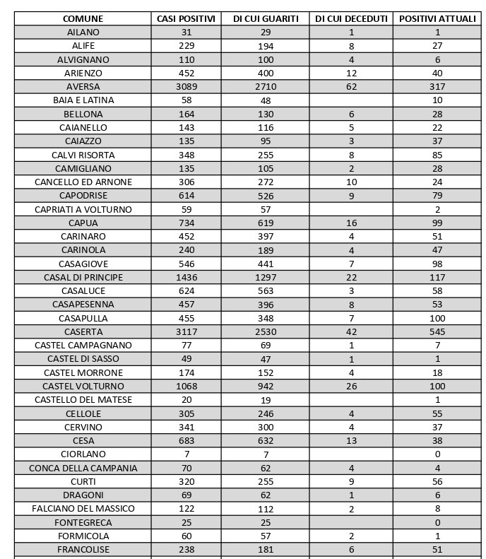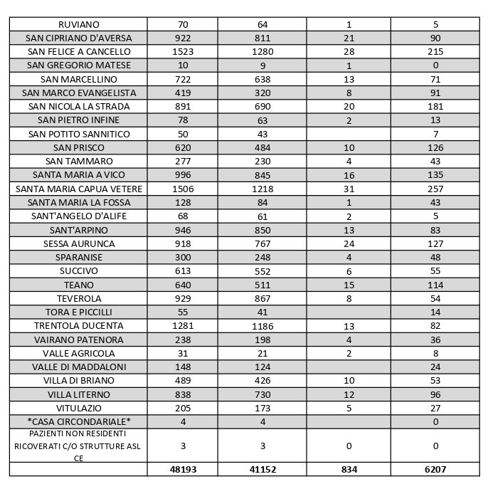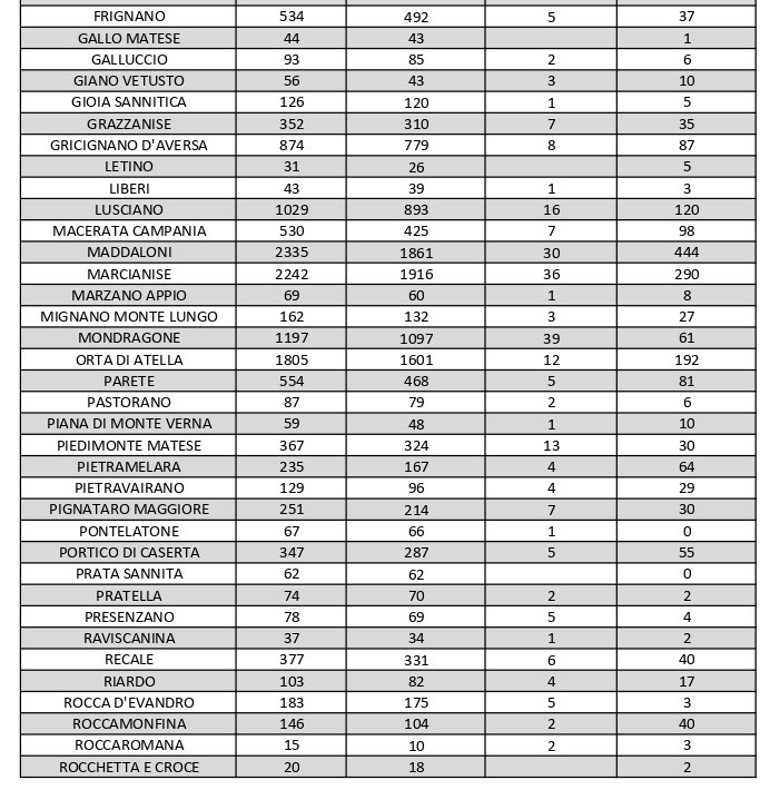 I numeri di Aversa vanno letti tenendo conto anche dei casi dei Comuni limitrofi: le persone attualmente positive sono 51 a Carinaro, 58 a Casaluce, 38 a Cesa, 87 a Gricignano d’Aversa, 120 a Lusciano, 81 a Parete, 71 a San Marcellino, 54 a Teverola e 82 a Trentola Ducenta. Nei centri siti ai margini dell’Agro aversano la situazione è la seguente: Casal di Principe conta 117 contagi, Casapesenna 53, Frignano 37, Orta di Atella 192, San Cipriano d’Aversa 90, Sant’Arpino 83, Succivo 55 e Villa di Briano 53.