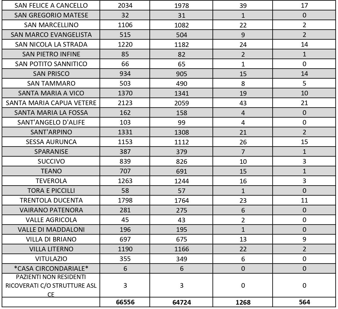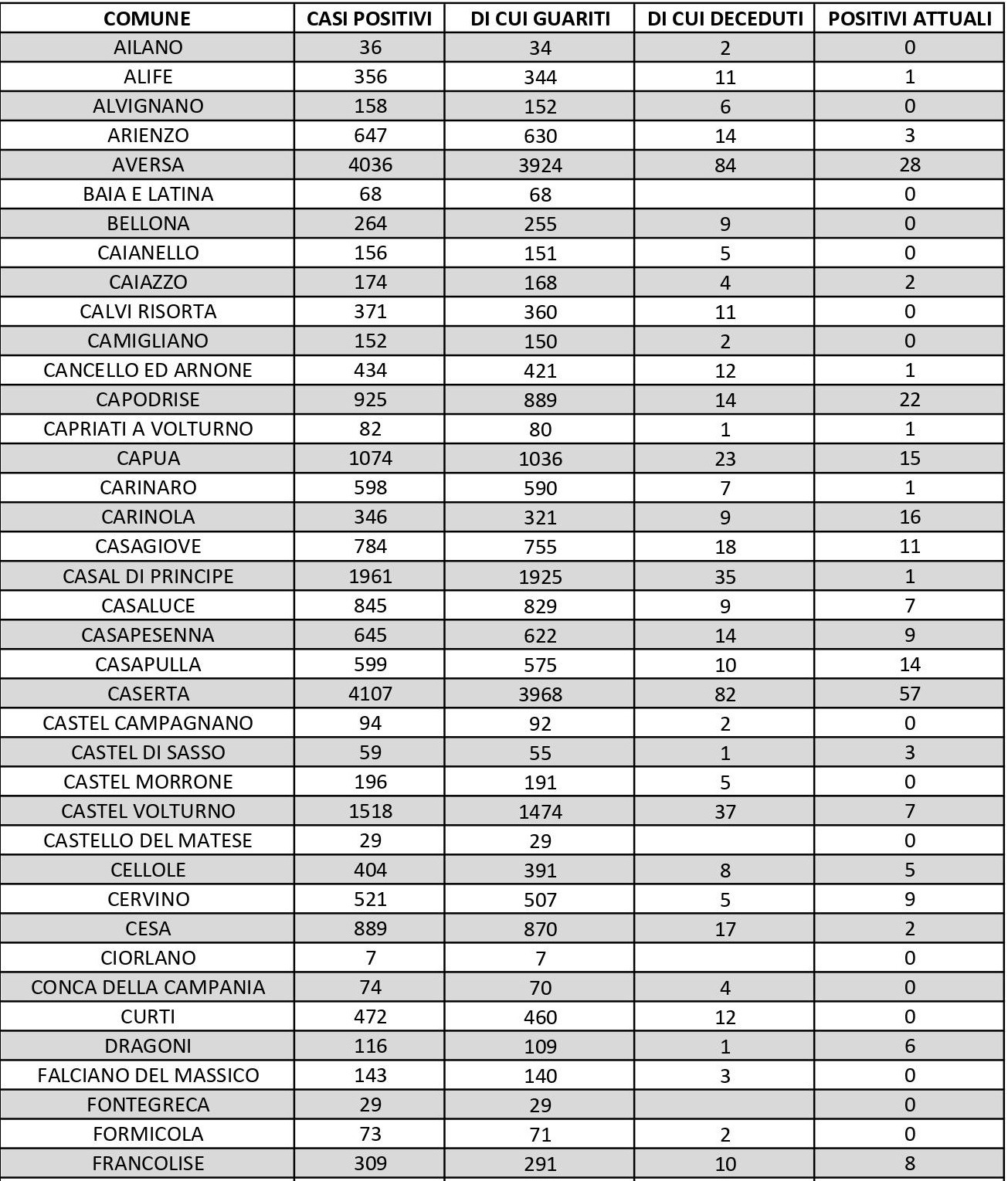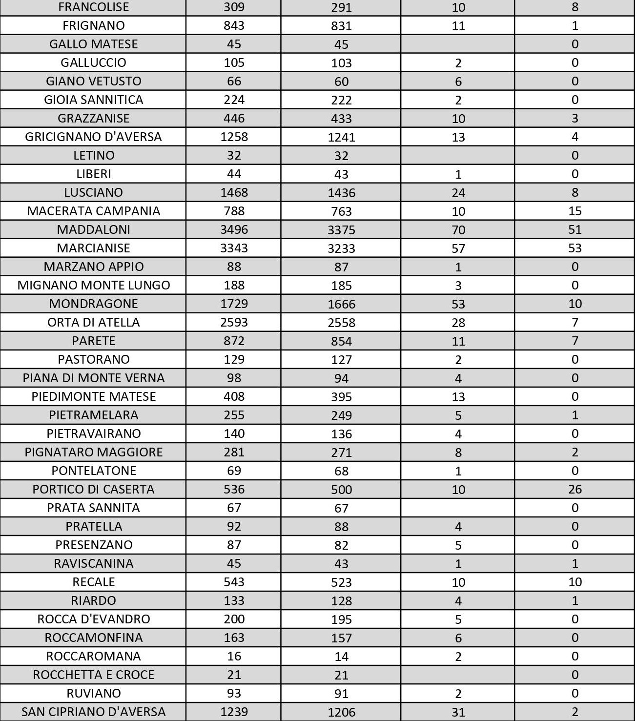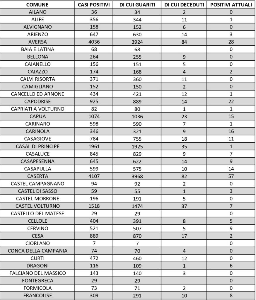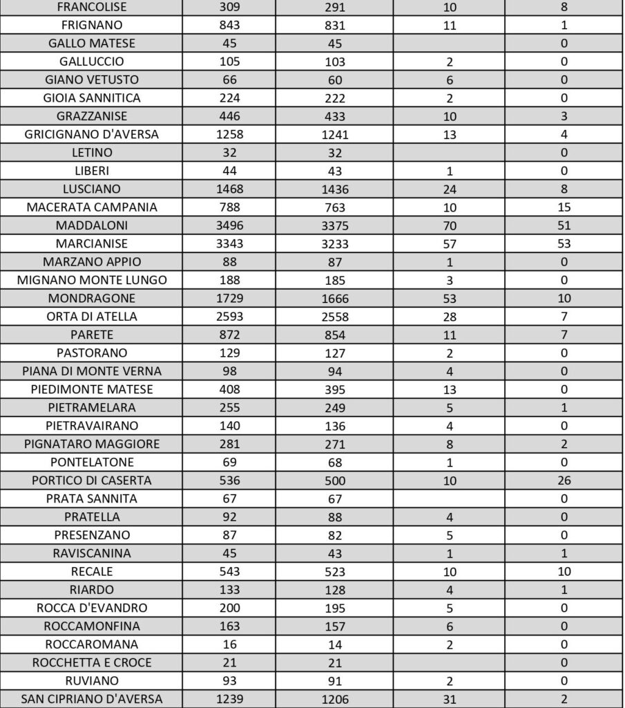 I dati di Aversa vanno letti tenendo conto anche dei casi nei Comuni dell’intero Agro, area densamente popolata con i centri abitati tutti adiacenti tra loro. Questi i dati riferiti alle singole realtà territoriali: le persone attualmente positive sono 1 a Carinaro, 7 a Casaluce, 2 a Cesa, 4 a Gricignano d’Aversa, 8 a Lusciano, 7 a Parete, 3 a Teverola, 11 a Trentola Ducenta. Negli altri centri la situazione è la seguente: Casal di Principe conta 1 contagio, Casapesenna 9, Frignano 1, Orta di Atella 7, San Cipriano d’Aversa 2, San Marcellino 2, Sant’Arpino 2, Succivo 3, Villa di Briano 9 e Villa Literno 2. Al di fuori dell’Agro aversano, vanno segnalati i numeri relativi ad altri grossi centri della provincia, nei quali la situazione dei contagi attivi al momento è la seguente: ve ne sono 15 a Capua, 11 a Casagiove, 7 a Castel Volturno, 10 a Mondragone, 17 a San Felice a Cancello, 14 a San Nicola la Strada, 10 a Santa Maria a Vico e 15 a Sessa Aurunca.