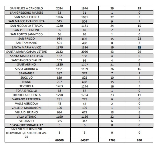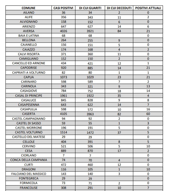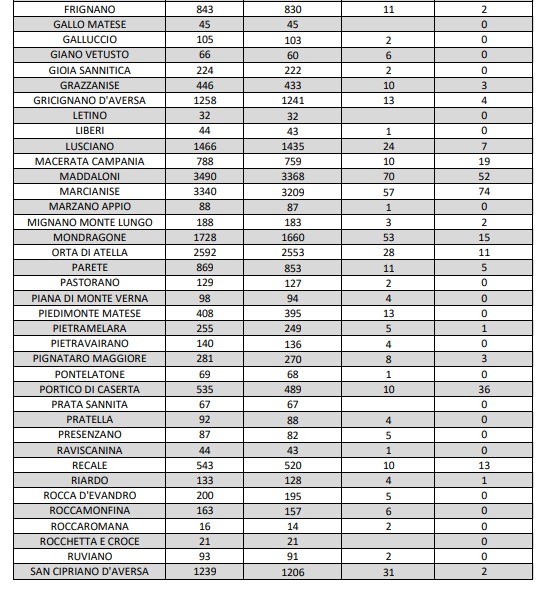 Nel bollettino odierno il numero dei contagi attivi nella città di Caserta è di 60 casi; tuttavia la città col maggior numero di casi in tutta la provincia resta Marcianise con 74 contagi, seguita dal capoluogo e da Maddaloni con 52 contagi attivi; seguono a loro volta Santa Maria Capua Vetere con 29 casi e Capua con 21. Anche ad Aversa si contano 21 casi positivi, ma i dati della città normanna vanno letti tenendo conto anche dei casi degli altri Comuni dell’Agro aversano, area densamente popolata con i centri abitati tutti adiacenti tra loro. Questi i dati riferiti alle singole realtà territoriali: le persone attualmente positive restano 2 a Carinaro, 8 a Casaluce, 2 a Cesa, 4 a Gricignano d’Aversa, 7 a Lusciano, 5 a Parete, 3 a Teverola e 11 a Trentola Ducenta.