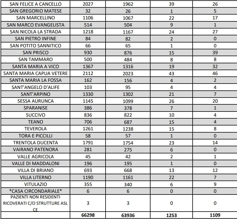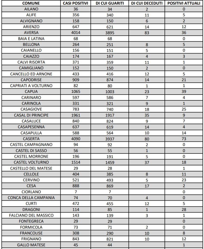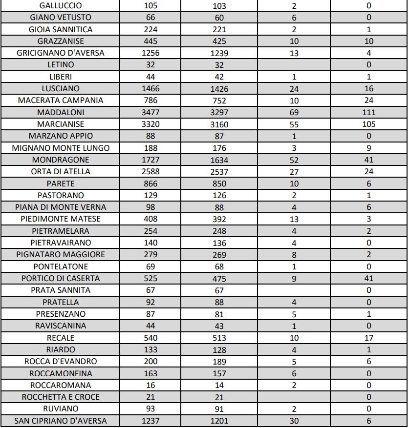 I dati di Aversa vanno letti tenendo conto anche dei casi nei Comuni dell’intero Agro aversano, area densamente popolata con i centri abitati che sono confinanti tra di loro. Questi i dati riferiti alle singole realtà territoriali: le persone attualmente positive sono 4 a Carinaro, 7 a Casaluce, 2 a Cesa, a Gricignano d’Aversa sono 4, a Lusciano 16, a Parete 6 e a Teverola 8. Negli altri centri la situazione è la seguente: Casal di Principe conta 9 contagi, Casapesenna 4, Frignano 12, San Cipriano d’Aversa 6, San Marcellino 17, Sant’Arpino 7, Trentola Ducenta 14, Succivo 4, Villa di Briano 12 e Villa Literno 7. Al di fuori dell’Agro aversano, vanno segnalati i numeri relativi ad altri grossi centri della provincia, nei quali la situazione dei contagi attivi al momento è la seguente: a Casagiove sono 25 , a Castel Volturno 18 , a Mondragone 41 , a San Felice a Cancello sono 26, a San Nicola la Strada 27, a Santa Maria a Vico 32, a Santa Maria Capua Vetere 46 e a Sessa Aurunca 20.