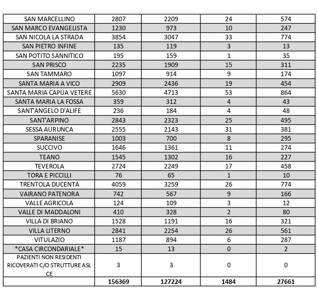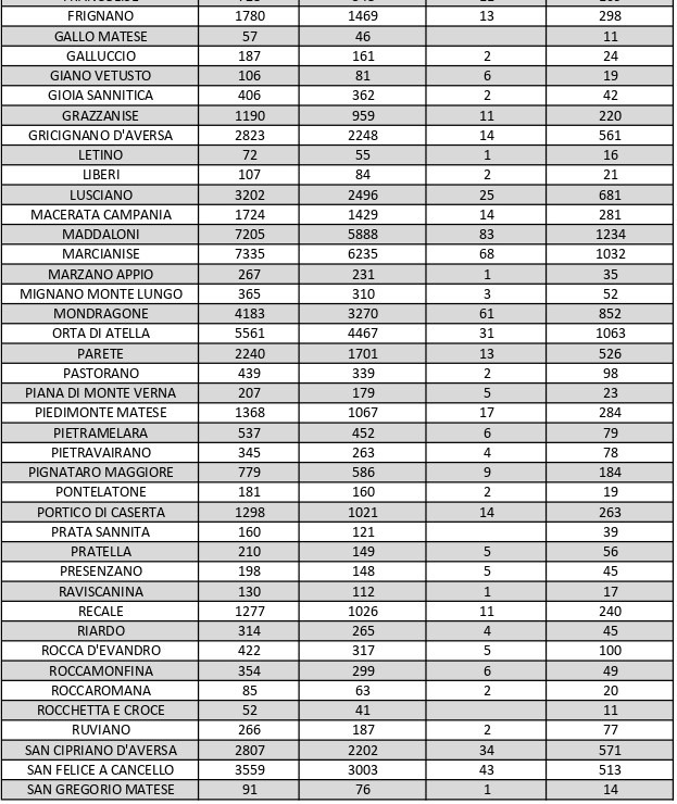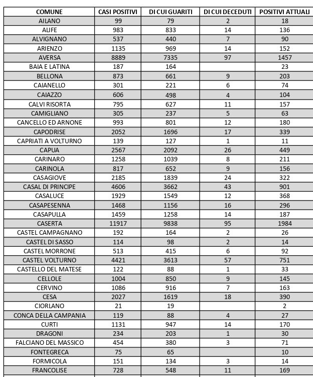 La città più colpita di tutta la provincia risulta essere Caserta con 1.984 casi positivi al Covid, Aversa con 1.457, Maddaloni 1.234, Orta di Atella 1.063, Marcianise 1.032, Santa M. C. Vetere 864, Mondragone 952, Casal di Principe con 901. Segue elenco dei dati del bollettino sanitario città per città: