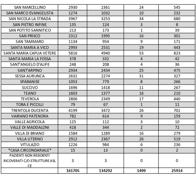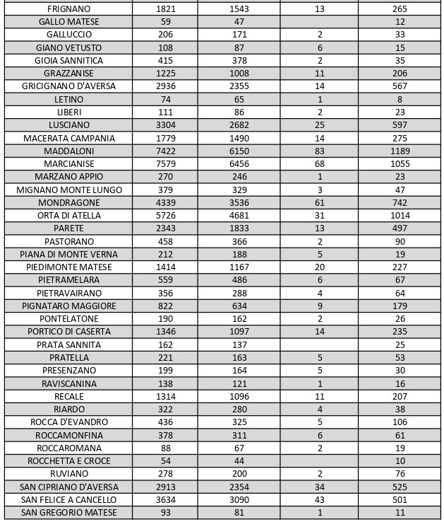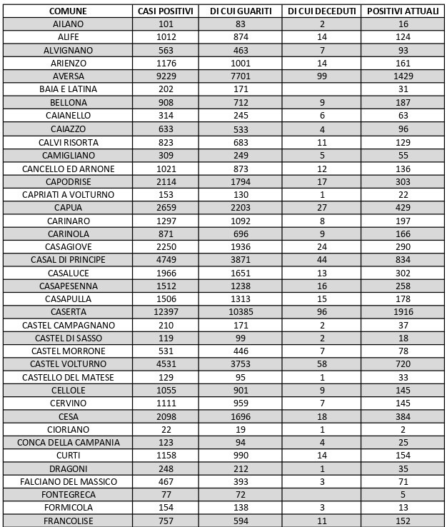 La città più colpita di tutta la provincia risulta essere Caserta con 1.916 casi positivi al Covid, Aversa con 1.429, Maddaloni con 1.189, Orta di Atella con 1.014, Marcianise con1.055, Casal di Principe con 834, Mondragone con 742, Santa M. C. Vetere con 823. Segue elenco dei dati del bollettino sanitario città per città: