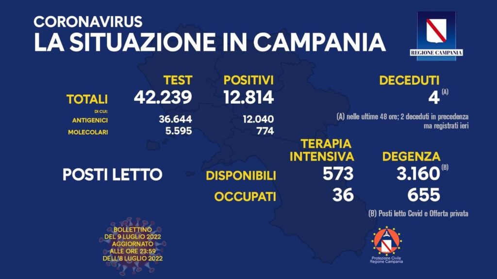 Cala l’indice di positività, crescono i ricoveri “ordinari”. Oggi sono 12.814 i nuovi positivi comunicati dall’Unità di crisi regionale in Campania, su un totale di 42.239 test effettuati. Il tasso di incidenza scende al 30,33% contro il 33,49 del giorno precedente.
