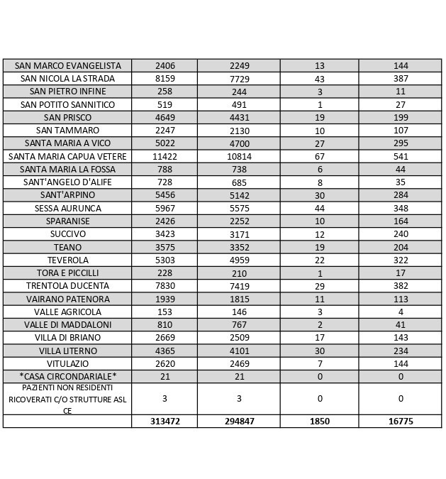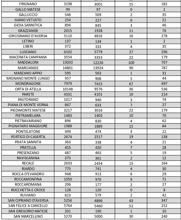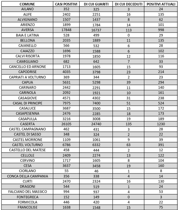 La città più colpita di tutta la provincia risulta essere Caserta con 1.230 casi positivi, Aversa con 998 Marcianise con 787, Maddaloni con 707, Santa M. C. Vetere con 541, Orta Di Atella con 536, Casal di Principe con 524, Mondragone 497, San Nicola La Strada con 387 casi, Trentola Ducenta con 382, San Cipriano D’Aversa con 347.