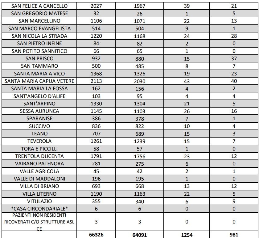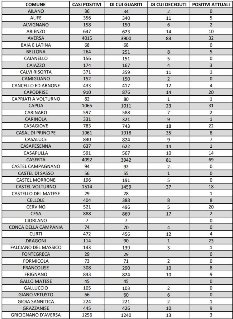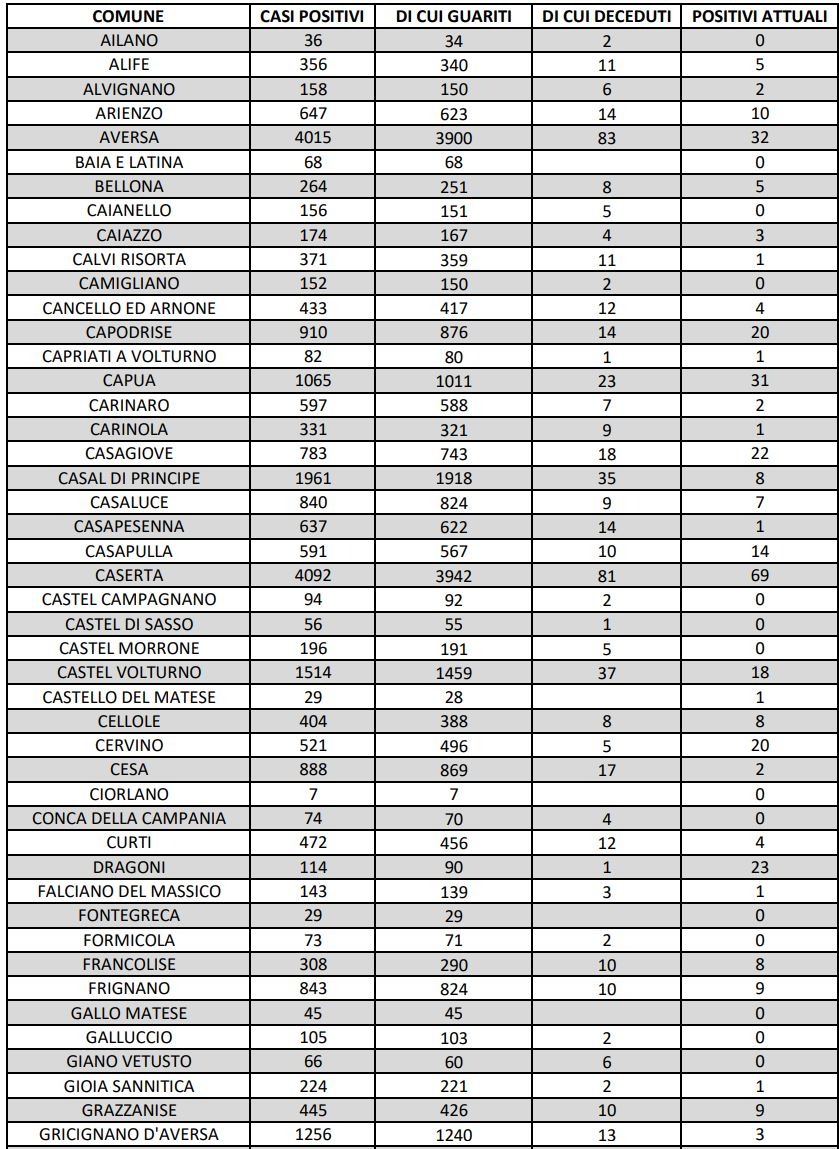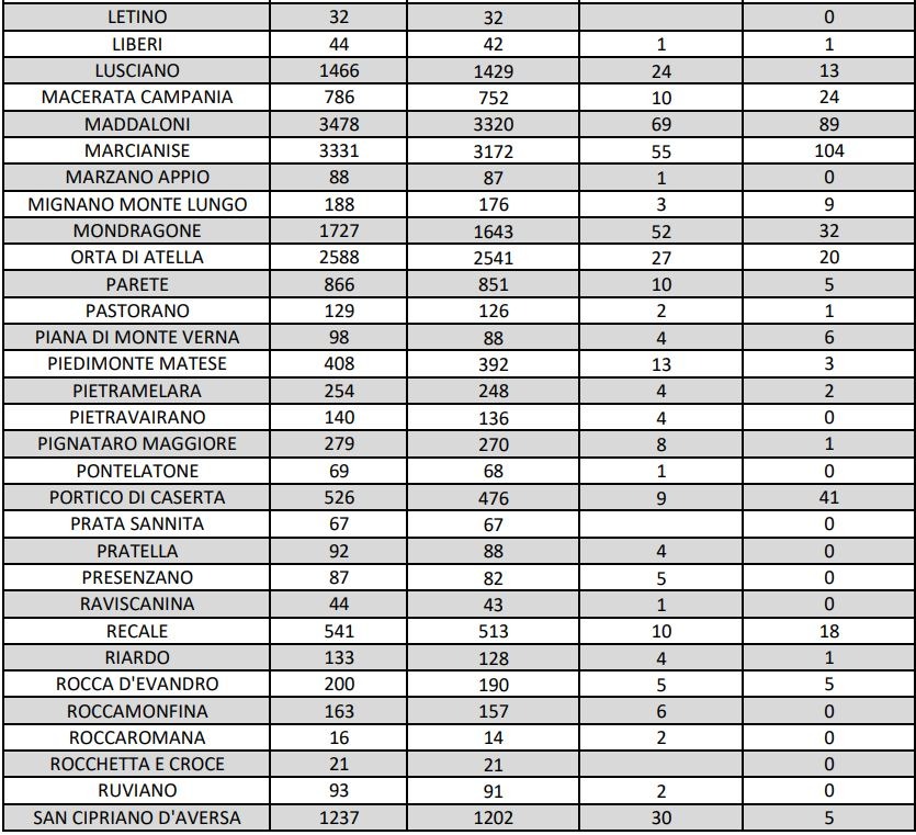 I dati di Aversa vanno letti tenendo conto anche dei casi nei Comuni dell’intero Agro aversano, area densamente popolata con i centri abitati che sono confinanti tra di loro. Questi i dati riferiti alle singole realtà territoriali: le persone attualmente positive sono 2 a Carinaro, 7 a Casaluce, 2 a Cesa, a Gricignano d’Aversa sono 3, a Lusciano 13 , a Parete 5 e a Teverola 7. Negli altri centri la situazione è la seguente: Casal di Principe conta 8 contagi, Casapesenna 1, Frignano 9, San Cipriano d’Aversa 5, San Marcellino 13, Sant’Arpino 5, Trentola Ducenta 12, Succivo 4, Villa di Briano 12 e Villa Literno 5.