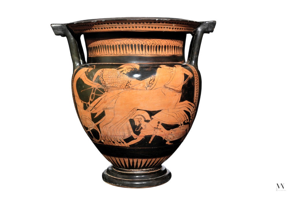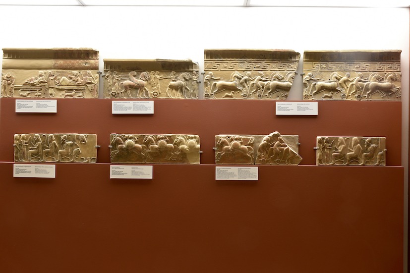 Ma ancora, sempre da Cuma proviene un cratere a colonnette a figure rosse (600-575 a.C.), recante la rappresentazione della Gigantomachia. La particolarità sta proprio nel fatto che il soggetto raffigurato e il ruolo del rinvenimento si incontrano: i Campi flegrei sono lo spazio in cui viene combattuta la battaglia tra gli dei dell’Olimpo e i Giganti. A chiudere il percorso su Gli Etruschi al Mann, un’incursione nella seconda sezione della mostra: le terrecotte architettoniche dal Tempio delle stimmate di Velletri fanno parte del patrimonio del Mann, perché tesori della collezione Borgia. In particolare, si tratta di lastre di rivestimento degli elementi in legno della trabeazione (550-525 a.C.), dove è possibile vedere la raffigurazione di una processione di cavalieri e carri, dell’apoteosi di Eracle all’Olimpo e di una scena di banchetto.