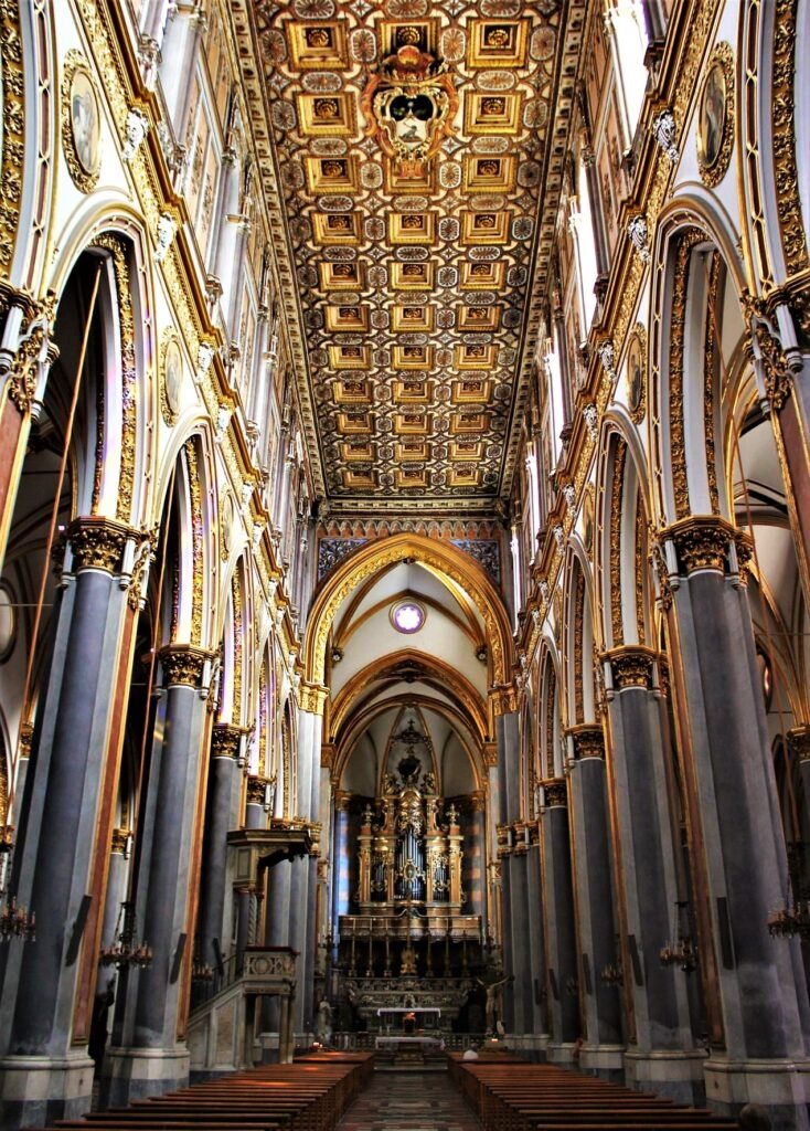 Entrando nella basilica, gli occhi del visitatore vengono immediatamente catturati dalle imponenti navate e dalla magnifica volta della sagrestia, impreziosita dal sontuoso affresco di Francesco Solimena Il trionfo della fede sull’eresia. All’ombra di questo capolavoro barocco giace la salma del Cardinale Richard Luke Concanen, primo vescovo di New York. La basilica era utilizzata in passato come luogo di sepoltura della dinastia aragonese, che elesse il tempio cattolico a panthéon della casa reale. Dalla cattedrale è possibile accedere al Museo Doma, con la sua Sala degli Arredi Sacri, dove sono custodite diverse opere d’arte, oggetti di culto e abiti di grande valore appartenuti ai sovrani del Regno di Napoli. Della collezione fa parte anche un bellissimo Salvator Mundi di scuola leonardesca, ritrovato nel 2021 dopo essere stato trafugato. In questi ambienti erano un tempo custodite le teche in argento contenenti i cuori dei regnanti di Napoli, dei quali però si è persa ogni traccia.
