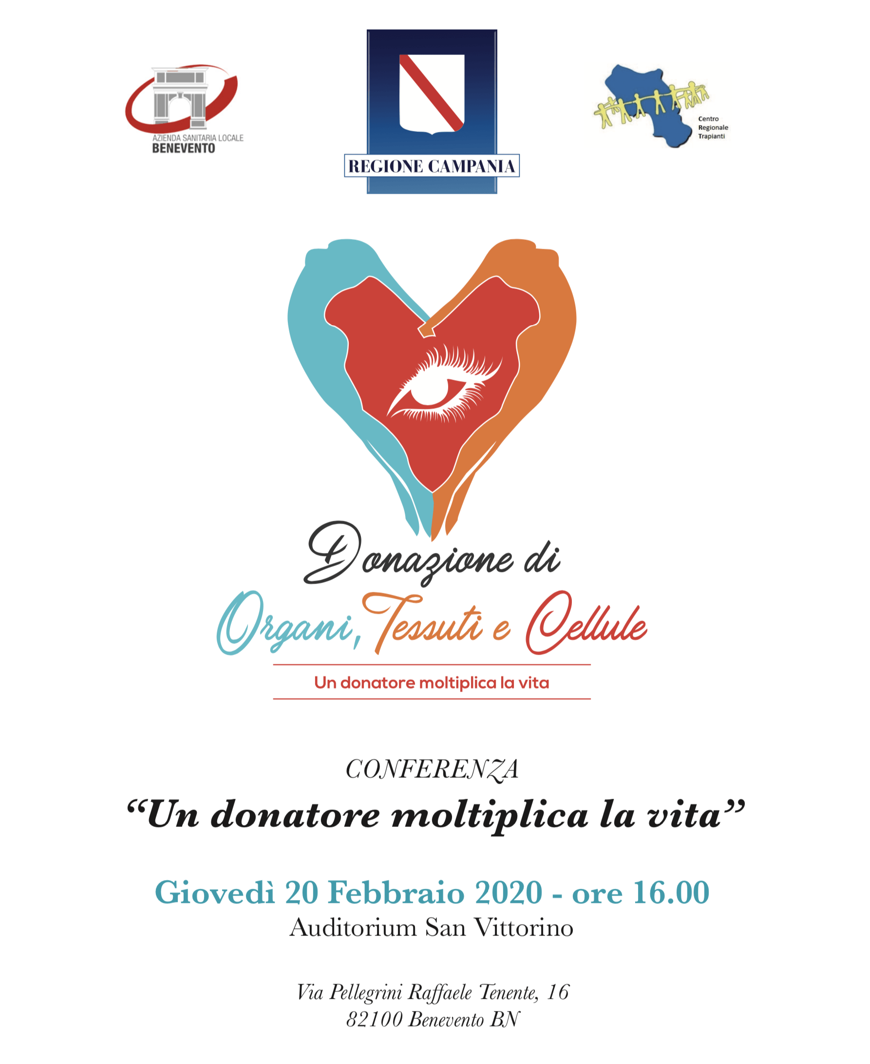“Un donatore moltiplica la vita” e una maggiore conoscenza su questo argomento toglie via ogni possibile preconcetto. È ciò che ha spinto la Regione Campania, in collaborazione con l’Asl di Benevento, a promuovere un evento di sensibilizzazione e divulgazione della cultura della donazione di organi e tessuti. Organizzato da Mariarosaria Focaccio, il convegno si terrà giovedì 20 febbraio 2020, alle ore 16, nei suggestivi spazi dell’auditorium San Vittorino, a Benevento.