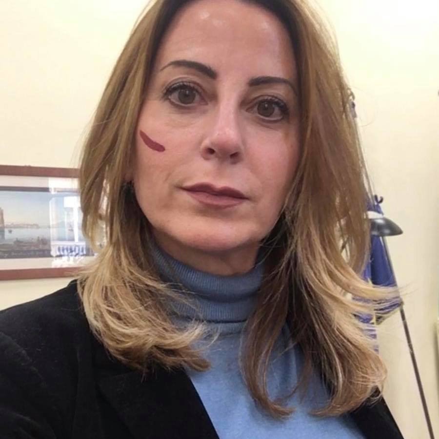 L’assessore Lucia Fortini con il riconoscibile segno rosso contro la violenza sulle donne