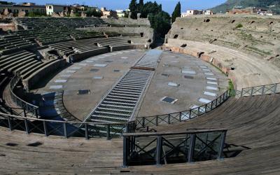 Pozzuoli (NA). Anfiteatro Flavio. L’Anfiteatro Flavio, di pianta ellittica che misura 149 x 116 metri e con la cavea divisa in tre livelli di gradinate capaci di contenere fino a 40.000 spettatori, è la terza arena del mondo romano per dimensioni dopo quelle di Roma e Capua. Pozzuoli fu l’unica città dell’Italia antica, ad eccezione di Roma, ad avere due anfiteatri, e ciò conferma che la città era considerata strategica sia per l’aspetto commerciale sia per l’elevato numero di cittadini. L’Anfiteatro Minore, scoperto a inizio ‘900, è stato sventrato in occasione dei lavori di costruzione della linea ferroviaria Napoli – Roma; l’Anfiteatro Flavio, invece, fu costruito perché il primo non possedeva i sotterranei e tutti gli accorgimenti necessari per celebrare i grandi spettacoli che si addicevano a una metropoli come Puteoli. L’anfiteatro è detto Flavio perché si ipotizza che la sua costruzione sia avvenuta sotto l’imperatore Vespasiano (69 – 79 d.C.) e ciò sarebbe confermato dalla presenza di un’iscrizione apposta su ciascuno degli ingressi principali: Colonia Flavia Augusta Puteolana Pecunia Sua.