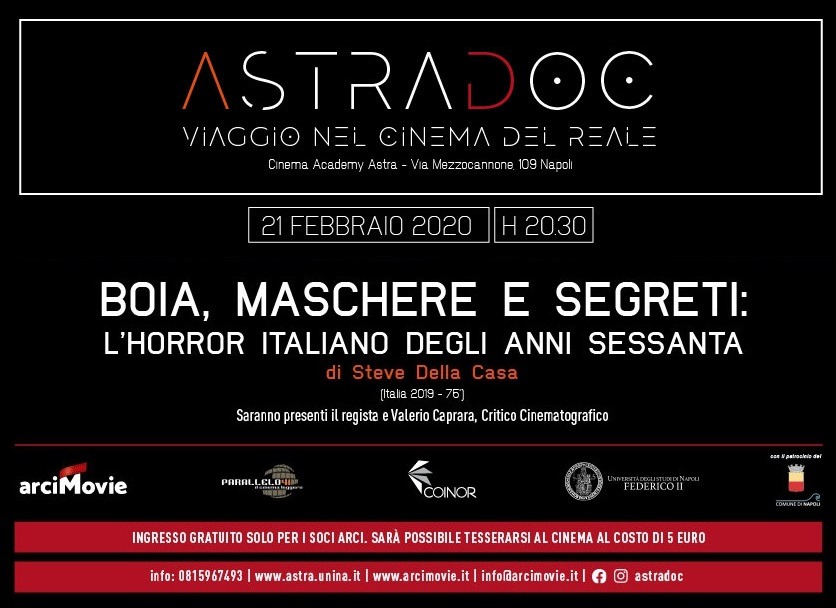 La sempre più interessante rassegna napoletana AstraDoc – Viaggio nel cinema del reale continua ad aggiungere nomi prestigiosi e proiezioni di notevole livello al suo cartellone. La lista è eterogenea, con rappresentanti significativi di una vasta gamma di generi cinematografici e tendenze artistiche. Venerdì 21 febbraio, alle 20.30, al cinema Academy Astra di via Mezzocannone arriva Steve Della Casa, critico cinematografico e direttore artistico di grande esperienza. L’autore torinese presenterà il suo lavoro più recente, un documentario dedicato a una tra le sue grandi passioni cinéphile e intitolato Boia, maschere e segreti. L’horror italiano degli anni Sessanta. La serata, organizzata come di consueto da Arci Movie, Parallelo 41 Produzioni, Coinor e Università “Federico II” di Napoli, col patrocinio del Comune di Napoli, vedrà la partecipazione, oltre che del regista, anche di Valerio Caprara, critico cinematografico e docente universitario.