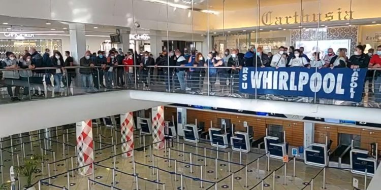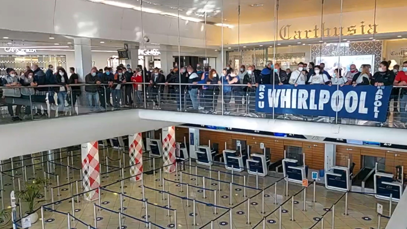 Non si ferma la protesta dei lavoratori della Whirlpool di Napoli. Nella mattinata di oggi gli operai della fabbrica chiusa dalla multinazionale americana hanno occupato l’aeroporto di Capodichino. Oltre cento ex dipendenti dello stabilimento di via Argine stanno protestando pacificamente nell’area antistante allo spazio delle partenze dello scalo. I lavoratori hanno esposto dal ballatoio uno striscione e urlano slogan contro la chiusura della fabbrica avvenuta il 31 ottobre scorso.