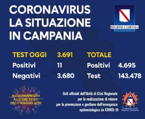 tamponi di cui 1 positivo; all’ospedale Sant’Anna e San Sebastiano sono stati esaminati 158 tamponi, nessuno dei quali positivo; all’Asl di Caserta presidi di Aversa-Marcianise sono stati esaminati 438 tamponi di cui 0 positivi; all’ospedale Moscati di Avellino sono stati esaminati 148 tamponi di cui 2 positivi; all’ospedale San Paolo di Napoli sono stati esaminati 197 tamponi di cui 1 positivo; al Laboratorio dell’Azienda ospedaliera Federico II sono stati esaminati 151 tamponi di cui 1 risultato positivo; all’Istituto Zooprofilattico Sperimentale del Mezzogiorno sono stati esaminati 367 tamponi di cui 0 risultati positivi; all’ospedale di Nola sono stati esaminati 133 tamponi di cui 2 risultati positivi; all’ospedale San Pio di Benevento sono stati esaminati 72 tamponi, di cui 2 positivi; al Laboratorio del Ceinge sono stati esaminati 481 tamponi di cui nessuno risultato positivo; al Laboratorio Biogem sono stati esaminati 38 tamponi di cui 1 risultato positivo. I contagiati registrati nella serata di ieri sono in leggero calo, 11 su 3.691 tamponi effettuati. I casi di Covid-19 in in Campania in totale comunicati dall’Unità di crisi finora salgono a 4.695. Il totale complessivo di tamponi effettuati è pari a 143.478.