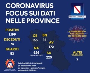L’unità di crisi della Regione Campania ha comunicato che nella tarda serata di ieri sono pervenuti i risultati dei tamponi dell’ospedale Sant’Anna e San Sebastiano di Caserta, che ha effettuato altri 47 test di cui 5 risultati positivi. Pertanto il numero complessivo dei contagiati in Campania è di 1199 persone, così ripartito su base provinciale: provincia di Napoli 626 (322 Napoli città e 304 Napoli provincia); provincia di Salerno 220; provincia di Avellino 172; provincia di Caserta 165; provincia di Benevento 14. Altri in fase di verifica 2. I deceduti sono in totale 74, i guariti 53. I casi di Coronavirus in regione sono saliti a 1199.